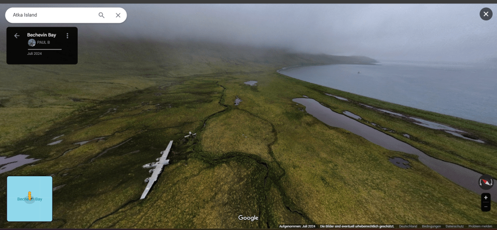 Atka island, located in the Pacific Ocean, is inhabitated by 95 people. In WW2, the US had a military airport there, and the plane you can see in the picture below is a consolidated B24 bomber, which unfortunately crashed.