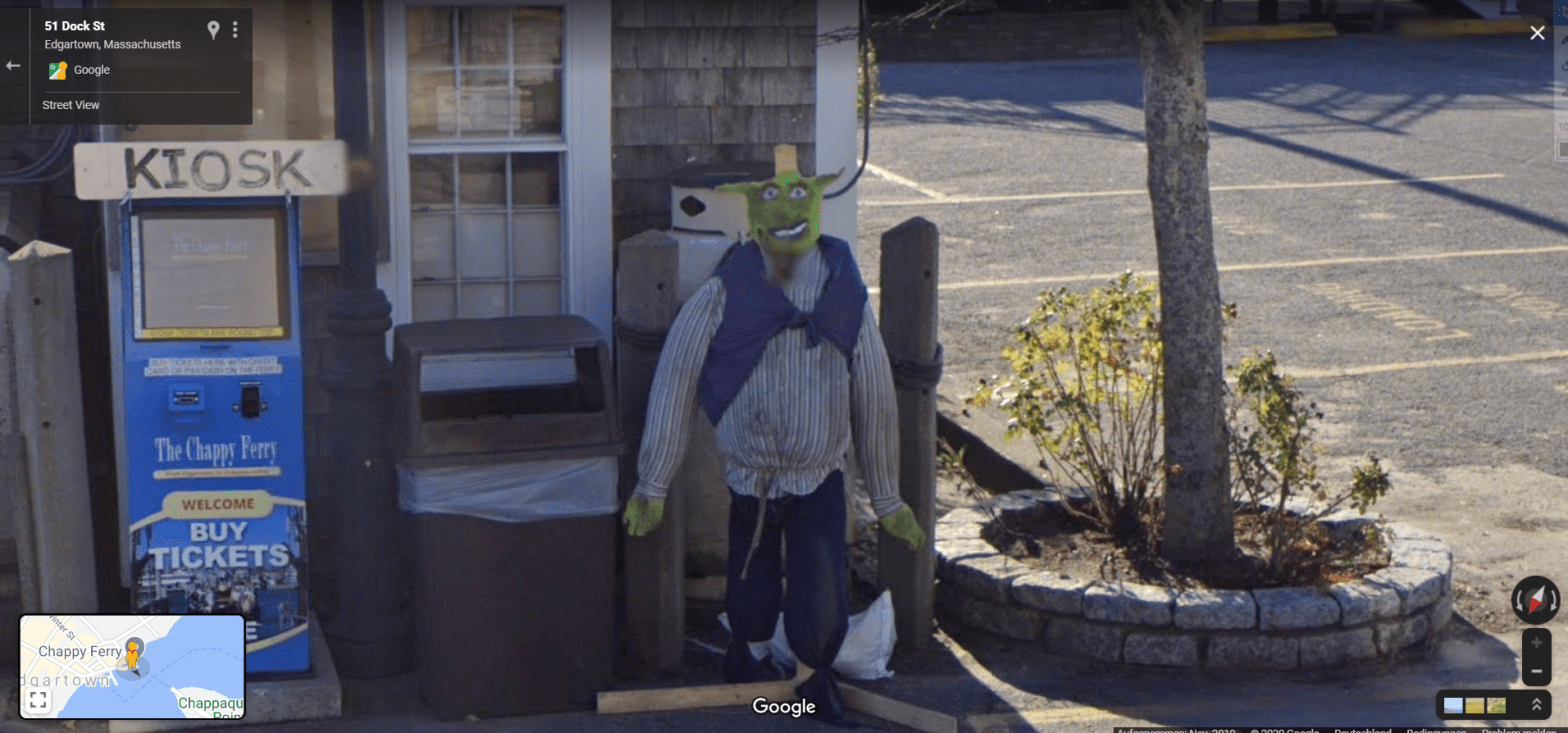 Shrek is back Google Maps link: https://www.google.com/maps/@41.3895091,-70.5102317,3a,15y,150.77h,79.46t/data=!3m6!1e1!3m4!1s-8NWOIqELnEP4kWG0Z6lXw!2e0!7i16384!8i8192