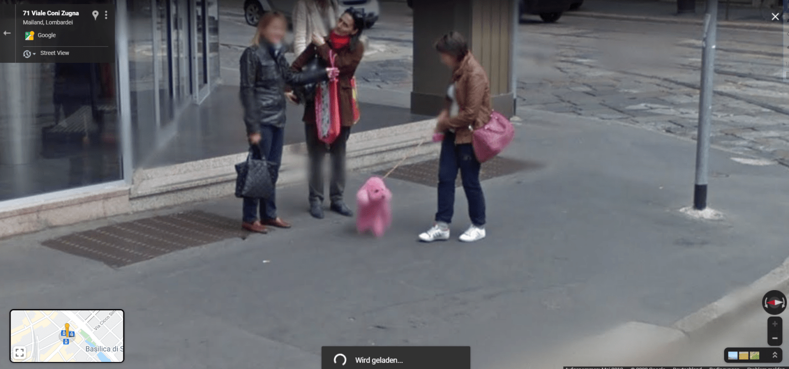 Pink Dog Google Maps Link: https://www.google.com/maps/@45.4552423,9.1723237,3a,21.1y,64.99h,76.81t/data=!3m6!1e1!3m4!1sZ_BZ8lD6c1EzD0uCDeJmtA!2e0!7i13312!8i6656