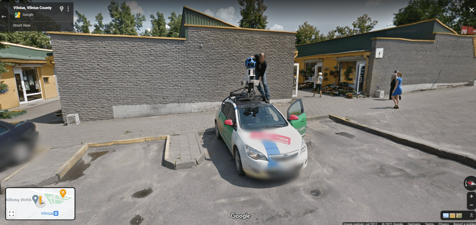 Climbing on the Google car https://www.google.com/maps/@54.6711539,25.28229,3a,55.5y,75.58h,78.5t/data=!3m6!1e1!3m4!1sYI6is0mXsX9-v1dFRcCp6Q!2e0!7i13312!8i6656