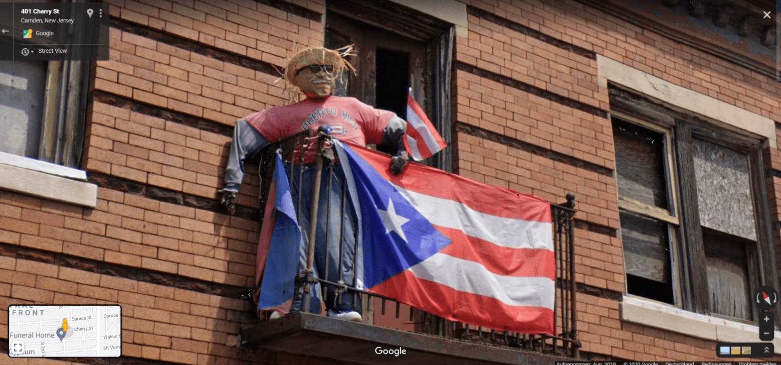 Scarecrow of Puerto Rico https://www.google.com/maps/@39.9342171,-75.1222412,3a,24y,34.28h,108.68t/data=!3m6!1e1!3m4!1sQfbDd2UwS2__RSROPgP7mw!2e0!7i16384!8i8192